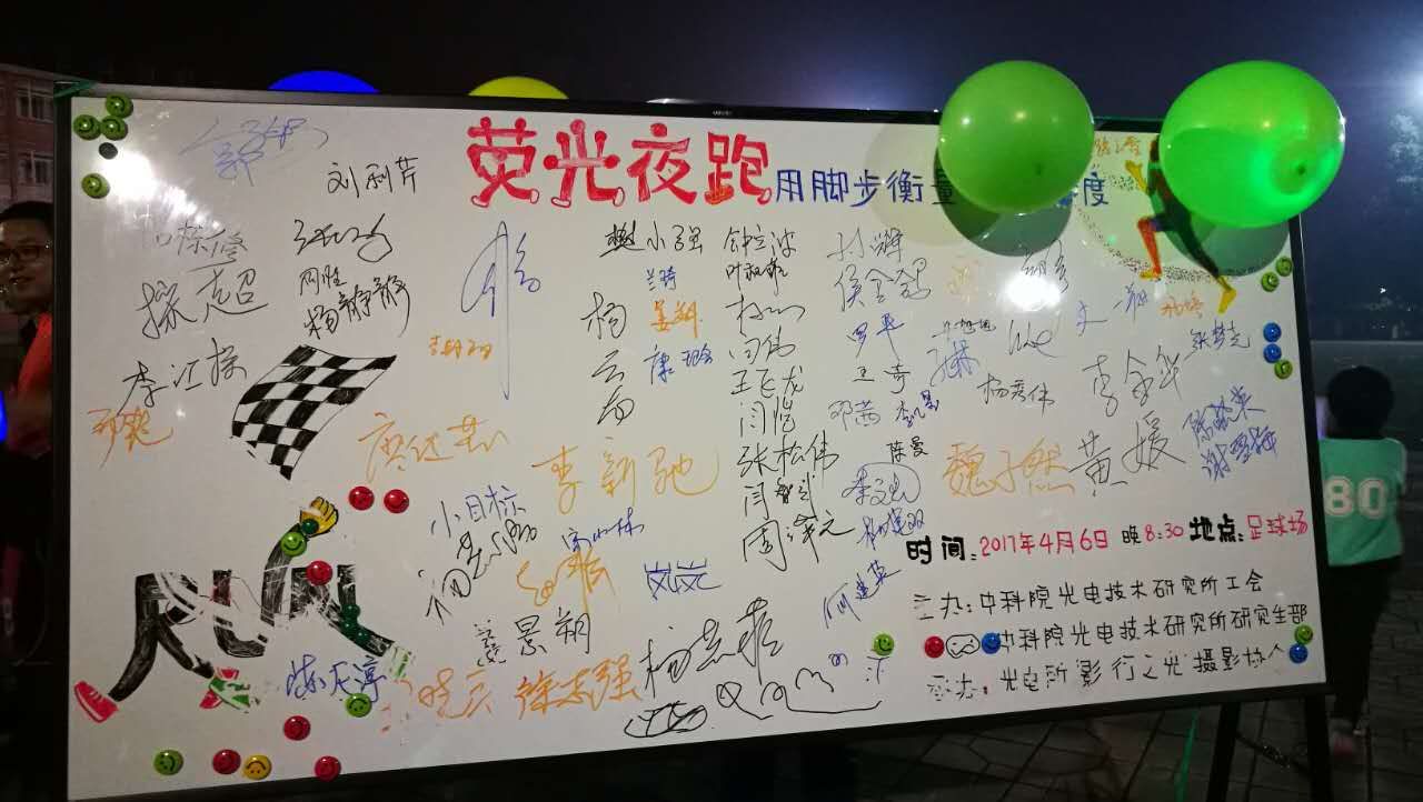 “荧光夜跑”是为期30天的全民健身活动,时间为4月7日至5月7日。在此期间内,每天完成3km跑步或者散步任务,打卡一次。30天内,打卡20次,即完成任务。最终根据打卡次数排名,打卡次数相同的,总里程多的排名在前。此次活动由光电所工会、研究生部主办,“影行之光” 摄影协会承办,同时也得到了光电所幼儿园、物业后勤大力支持。
