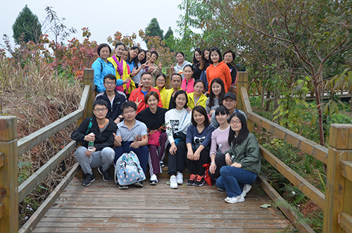 玉皇山山势不高,山丘与山丘之间以木制栈道相连。大家沿着木栈道一路而上,山路的一边种着高大挺拔的树木,另一边的山坡上有着成片的玉皇红杨,一条山路,两种不同的风景感受。现在正是菊花开放的季节,漫山弥漫着菊花的香气,让人流连忘返。爬山过程中同事们相互沟通、相互鼓励,营造了一个团结、互助、积极向上的活动氛围。