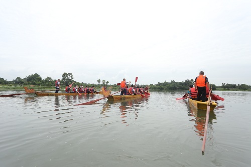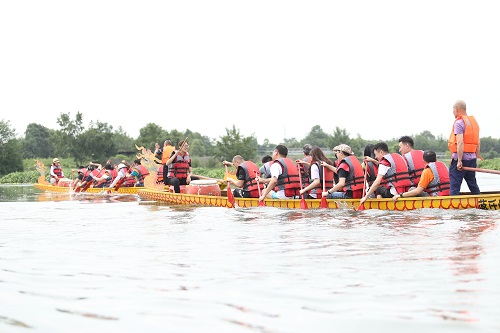 比赛中,33名队员分为红、蓝和橙三组,在500米的赛道上挥桨竞舟。鼓手稳坐船头,挥舞鼓槌咚咚催人奋进;选手们口号整齐划一、同心协力、密切配合、奋勇争先。河面上只见水花飞溅,龙舟争先恐后犹如离弦之剑飞驰远方;岸边拉拉队的加油声、欢呼声此起彼伏;整个场面十分热闹、壮观。经过激烈角逐,蓝队获得第一名,橙队获得第二名,红队获得第三名。