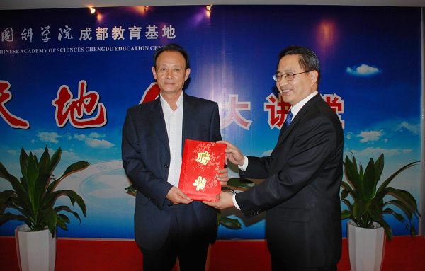 成都分院院长彭宇行代表成都教育基地管委会向李伯刚颁发成都教育基地客座教授聘书。成都分院党组书记彭玉水,副院长袁家虎,成都生物所副所长叶彦、成都有机所副所长王公应、邓金根等领导,成都地区相关培养单位教育干部,成都分院机关中层干部和职工参加了讲座。