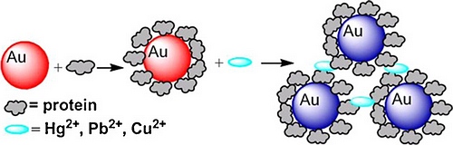中科院成都生物研究所天然产物研究中心邵华武研究员课题组与国家纳米科学中心蒋兴宇研究员课题组合作发展了一种用金纳米颗粒肉眼就可以检测水中的重金属离子的新方法。其操作是首先把含有多巯基的木瓜蛋白酶吸附在金纳米颗粒上,该蛋白表面的一些功能团(如巯基、羧基和氨基等基团)可以识别一些重金属离子(汞离子、铅离子和铜离子),而这些离子的加入则可以使金纳米颗粒聚集,同时在此过程中溶液的颜色则会从红色变为紫色,根据这个现象我们用肉眼就可以直接检测水中的重金属离子。实验结果表明,检测灵敏度与金纳米颗粒的大小有关,较大的金纳米颗粒的检测灵敏度更高。该方法在水质监测中将具有潜在的应用。