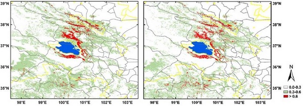 研究发现,普氏原羚将对未来气候变化非常敏感。随着时间推移,气候变化对普氏原羚适宜栖息地的影响程度将加剧。本研究为我们在不断加剧的全球变化下开展濒危物种保护提供了基础与实例,有利于进一步探索大尺度上生物多样性保护与全球变化研究。