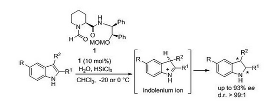 手性吲哚啉是天然产物和一些药物分子中普遍存在的主体骨架,因此对吲哚啉及其衍生物的高对映选择性合成方法研究一直是有机化学和药物化学研究的热点之一。直接对吲哚类化合物进行不对称催化还原是合成手性吲哚啉的一种最直接有效的方法,但适用于该方法的催化体系几乎全部为过渡金属催化剂,仅有的一例有机小分子催化体系也仅限于对3H-吲哚的还原。
