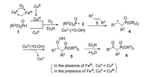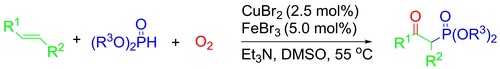 成都生物所天然产物研究中心分子结构多样性构建和药物化学实验室姬建新研究员课题组首次实现了利用氧气作为氧化剂和氧源催化氧膦化烯烃构建β-羰基膦酸酯。该课题组博士研究生魏伟采用同位素标记、自由基捕捉和LC-Ms/Ms等多种分析手段对反应机理进行了探讨,初步验证了反应的过程:氧气、CuBr2/FeBr3、Et3N直接引发磷自由基产生,随后磷自由基对烯烃选择性加成产生碳自由基,最后活化的分子氧氧化碳自由基实现了β-羰基膦酸酯的构建。β-羰基膦酸酯是一类极其重要的含氧化合物,它作为关键的中间体被广泛应用于著名的HWE反应中构建α,β-不饱和羰基化合物。该方法不仅提供了一个高效合成β-羰基膦酸酯的路径,而且展示了一类新型的利用氧气官能化有机分子的反应模式。