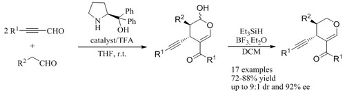 中科院成都生物所天然产物中心孙健课题组发现了一类新型的有机小分子催化炔醛自身缩合反应,并且成功的将这一反应和氧杂Diels-Alder反应组合,发展了一类新型的有机催化串联不对称反应方法,该方法可快速构建新型的多取代手性3,4-二氢吡喃,并获得了优良的收率、中等以上的非对映选择性(达9:1的dr值)和高对映选择性(达92%的ee值)。进一步的机理研究证明该方法中关键的炔醛自身缩合反应是经过有机小分子催化炔水合途径实现的。