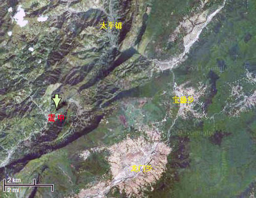 太平镇、宝盛乡、龙门乡与主震源的地理位置