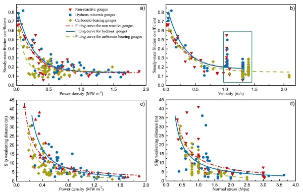 研究团队通过收集近280组岩石高速旋转摩擦试验数据,将试验岩样分为高温下稳定矿物(包含石英,正长石,斜长石等)、高温下发生脱水反应矿物(包含高岭石,蒙脱石,石膏等)和高温下发生脱碳反应矿物(石灰石,大理石等)三类。通过对试验数据进行整理、拟合和分析(图1)发现,功率密度弱化模型相对于速度弱化模型和法向应力弱化模型具有更好的趋势和相关性。通过对比不同尺寸式样(25mm直径,40mm直径,1m长宽)的摩擦系数及弱化距离变化趋势,发现式样尺寸越大,摩擦系数和弱化距离下降得越早,这种重要的尺寸效应将为我们推广实验尺度变化趋势到自然滑坡尺度提供重要支撑。