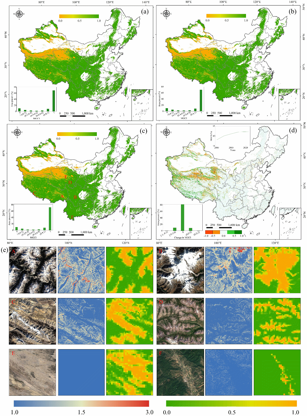 中国山地绿色覆盖指数时空分布(a,b,c分别为2000、2010和2022年指标估算结果,d为指标变化差异,e为局部细节特征)