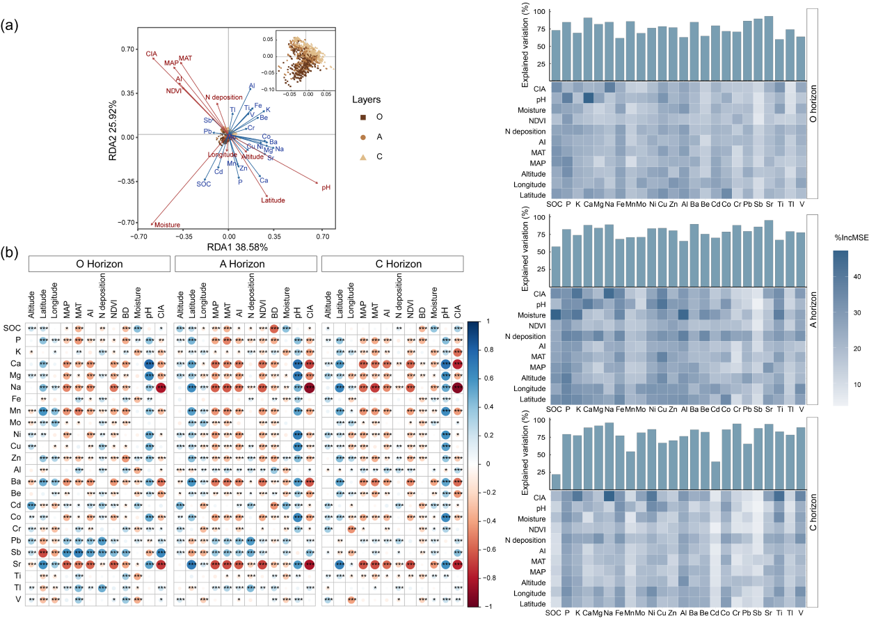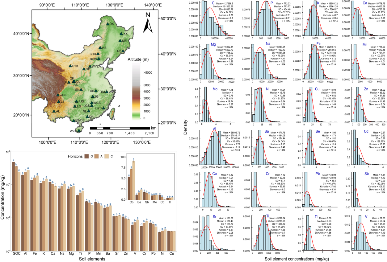 研究区横跨热带、亚热带、暖温带、温带和寒温带五大气候区,在 166 个样点、按照土壤发生层(有机层(O层)、表层矿质层(A层)和母质层(C层))采集了1300余份土壤样品。通过测定土壤中24种元素浓度(有机碳、磷、铝、钾、钙、镁、钠、铁、锰、钼、镍、铜、锌、钡、锶、钛、钒、钴、铍、镉、铬、铅、锑、铊)及主要理化属性(pH、含水率、容重),并整合气候、植被覆盖度、大气氮沉降、土壤类型和母质类型等环境因子,形成了一个覆盖范围广、信息维度高的山地土壤多元素数据集。该数据集为解析环境梯度下元素耦合关系、追踪养分与污染物迁移转化路径、改进地球生物地球化学模型以及评估生态系统服务与功能提供了坚实基础,具有广泛的应用前景,为山地生态系统的环境保护、生态保育和可持续管理提供了重要的数据支撑。