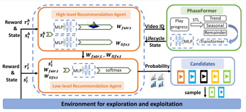 重构推荐公平性范式:以生命周期为核心的动态决策机制。交互式推荐系统(如短视频推荐)在提供个性化体验的同时,也面临长期公平性失衡的挑战:系统往往过度偏向热门内容,冷门或新内容难以获得曝光,形成“强者恒强”的马太效应。这种“流行度偏见”在长期运行中不断累积,最终破坏内容生态的多样性与可持续发展。针对这一问题,研究团队提出一种全新的视角——将数字内容的“生命周期”作为智能决策的控制变量。通过对海量短视频数据的系统分析,团队发现现代数字内容普遍遵循“快速成长—短暂稳定—迅速衰退”的三阶段新规律,这与传统的四阶段生命周期模型明显不同。基于这一发现,团队提出生命周期感知的分层强化学习框架(LHRL),实现了对推荐系统“短期用户满意度”与“长期生态公平性”的动态平衡。LHRL框架由两个核心部分组成: