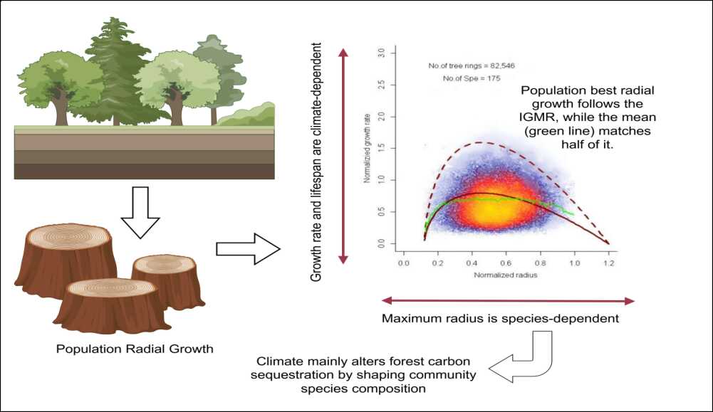 同时,基于代谢比例理论、功能性状权衡与环境筛选科学假设,自主发展了广义代谢生长模型(IGM,Iterative Growth Model),引入单位组织的“形成时间”(T)作为关键参数,揭示热力学第二定律对生物生长的底层约束机制。模型表明,随时间变化的生长轨迹通常没有解析解,由于T的变化(受热力学第二定律约束),生长曲线可能在 Richards 和 Gompertz 曲线之间变异,体现了生长的离散与迭代本质。研究发现,尽管单株树木因基因、气候和林分结构差异而呈现复杂多变的生长路径,但在种群尺度上,树木径向生长表现出显著且稳定的收敛规律,种群平均径向生长趋势大致遵循“最优生长轨迹”。气候变化与林分结构的不均一性主要驱动树木生长速率发生“漂移”,而非改变树木可达到的最大半径。外部环境变化对森林种群生长模式的影响更多体现在速率的空间–时间偏移,而非个体树木潜在大小的改变。