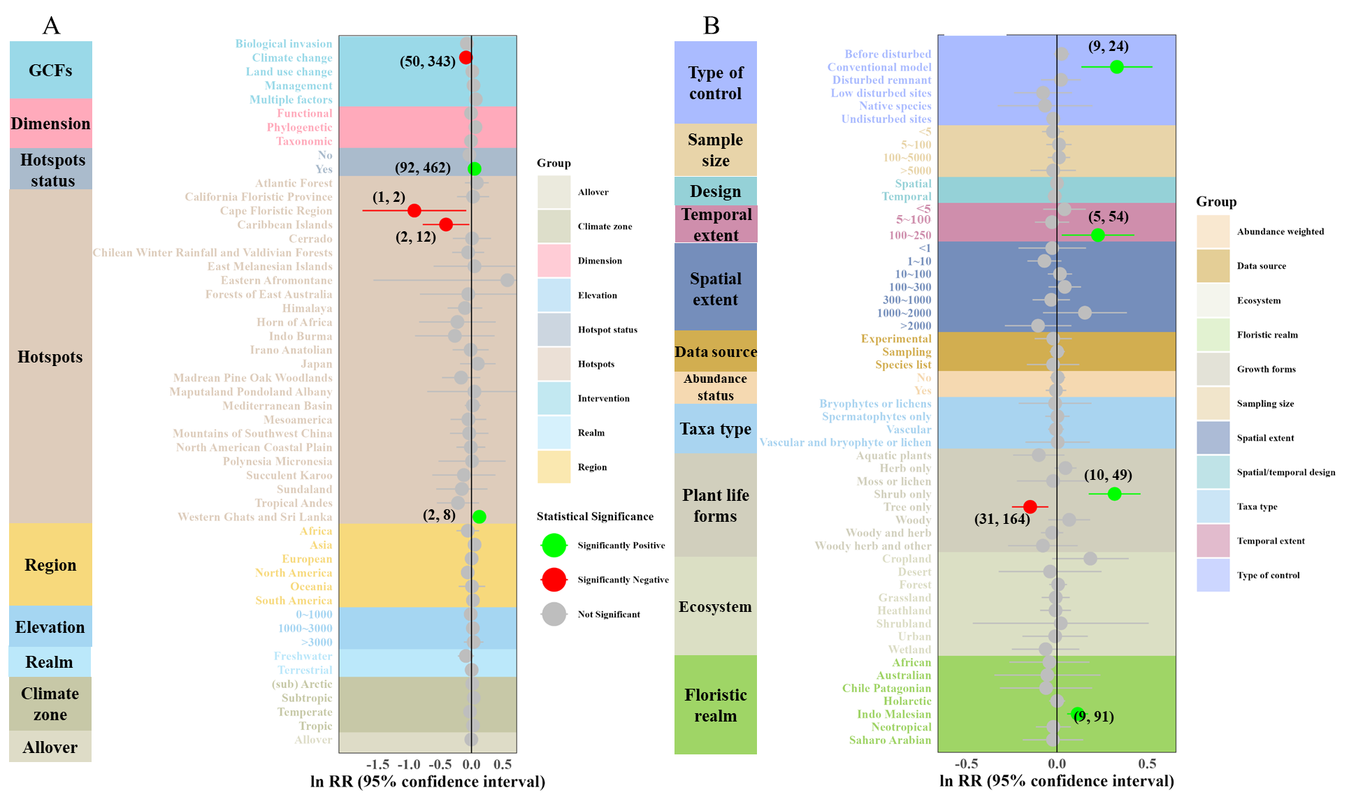 针对上述问题,中国科学院成都生物研究所庞学勇团队罗鹏课题组整合全球范围内的相关研究,对涵盖256项研究的1604组观测与实验数据进行了荟萃分析,首次从分类、功能和系统发育三个维度,综合评估了主要全球变化驱动因子对植物β多样性的影响。研究发现,全球尺度的植物β多样性并未呈现一致的显著净变化,但其响应模式在不同驱动因子、生物地理区域、生态系统和植物生活型间存在显著差异。具体而言: