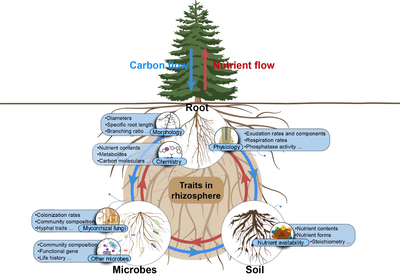 根际作为陆地生态系统物质、能量和信息交换最为剧烈复杂的关键界面,以根系分泌物为代表的根系活动深刻调控着根系-微生物-土壤各核心功能单元间“自上而下”的碳流与“自下而上”的养分流,形成一个以根际互作为核心、“牵一发而动全身”的根际生命共同体闭环系统。相应地,在根际微生态系统中,碳流与养分流的密切耦合在根际区驱动了一系列独特的根系–菌根真菌–微生物–土壤功能性状(即根际功能性状),且各功能单元性状之间存在着复杂而精密的协同与权衡关系,在调控植物环境适应策略与生态系统功能稳定等方面扮演着重要的生态与进化学意义。然而,受制于研究技术及根际微环境的高度异质性和复杂性,目前已有研究更多将根系、微生物和土壤等功能单元孤立地进行分析,而严重缺乏针对根际多功能单元性状协同策略及其生态学功能的系统性整合,使得现有对于根际在调控农林生态系统功能中的作用科学认识极为模糊,严重制约了人们根际在高效调控农业生产提质增效、退化生态系统功能恢复与减缓气候变化中的应用实践潜力。