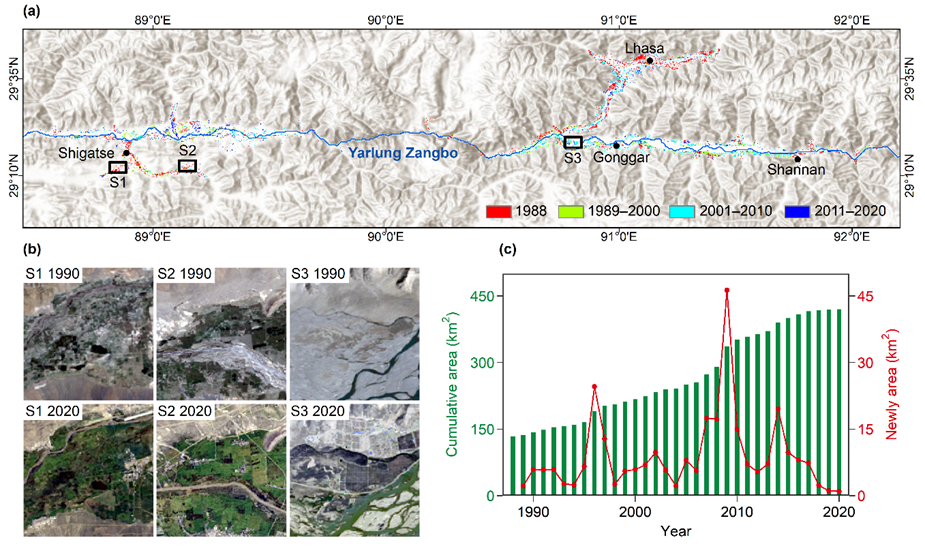 在全球升温与土地退化的双重挑战下,青藏高原雅鲁藏布江中游流域——这片被誉为"世界屋脊粮仓"的土地,通过持续40年的系统性植树造林工程成功逆转生态退化趋势。面对气候变化与人为活动引发的荒漠化威胁,在科学规划和政策引导下,该区域构建起兼具生态屏障与生产功能的绿色发展范式。基于所述背景,成都山地所山地地表过程智能监测与模拟团队联合国内外多家科研机构科研人员深入雅鲁藏布江干旱河谷布设野外观测网络,首次结合卫星遥感大数据量化评估植树造林的长时序生态效益(图1),揭示了植树造林对荒漠化逆转、区域水热平衡与农业系统的协同调控机制。