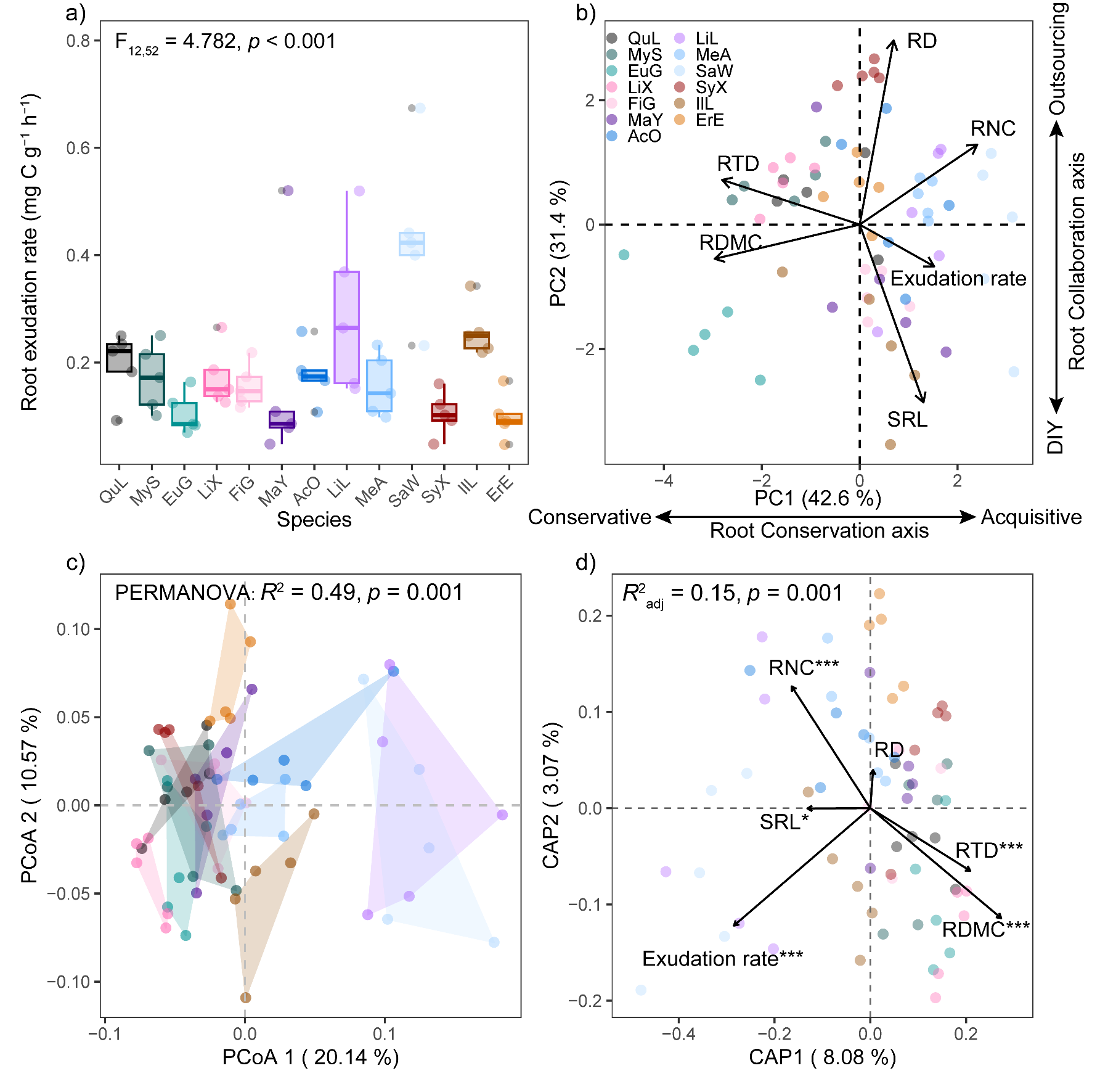 针对这一研究空白,中国科学院成都生物研究所尹华军团队以西藏墨脱亚热带森林中13种优势共存树种为对象,综合分析了各树种细根功能性状、分泌物分泌速率与代谢组成以及根际微生物功能特征,系统辨识了根系分泌物速率和组成在根系经济空间框架中的功能定位,及其在串联根系—微生物功能耦合中的核心作用。研究发现,沿根系资源“获取型—保守型”梯度,不同树种的根系分泌速率与化学组成呈现出显著的协同变化。具体地,随着树种策略从保守型向获取型转变,树木的根系分泌速率增加,其化学组成多样性也更为丰富(图1)。这种兼具“高通量—多样化”的根系分泌策略进一步招募了富营养型、快速生长微生物类群的聚集,从而构建起根系策略与根际微生物功能密切耦合的代谢桥梁(图2和3)。该研究首次证实了根系分泌物化学多样性是驱动根系与根际微生物等核心功能单元协同运作并促进共存树种地下策略分化的关键调控枢纽。
