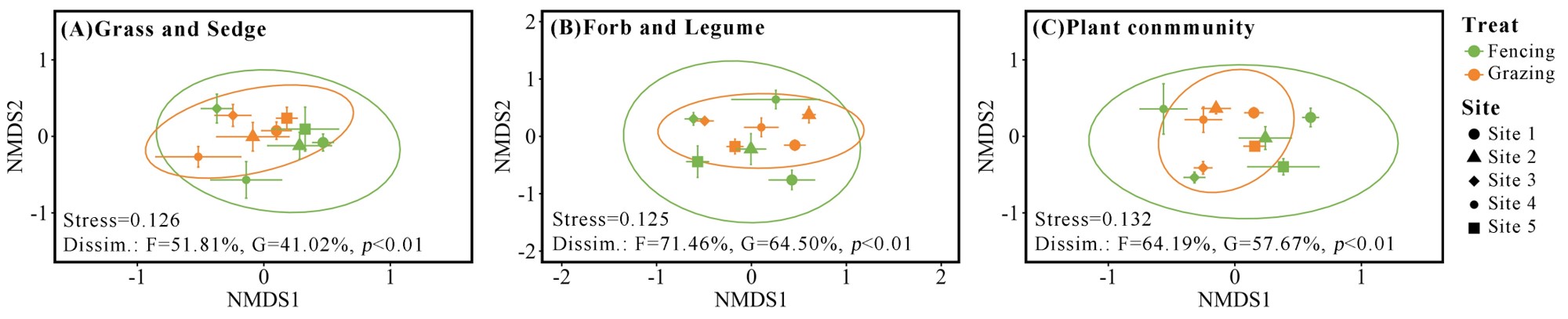 基于此,中国科学院成都生物研究所抗逆植物适应与筛选研究团队向双课题组以青藏高原东部典型高寒草甸为研究对象,选取5对长期围封(≥10年)与持续放牧样地进行对比,系统比较了两种管理模式下植物群落多样性的变化与土壤理化性质的差异,揭示了长期围封对草地生态系统多样性和稳定性的综合影响机制。研究结果表明:(1)长期围封禁牧导致植物群落α-多样性下降和β-多样性增加;(2)不同植物功能群的相似性变化趋势存在差异,杂类草是群落相似性降低的主要驱动因素;(3)长期禁牧后,土壤性质成为影响不同点位植物多样性的关键因素。围封条件下植物群落与高有机质土壤及快速生长型性状密切相关,而放牧样地则表现出更高的物种丰富度和更复杂的群落结构。