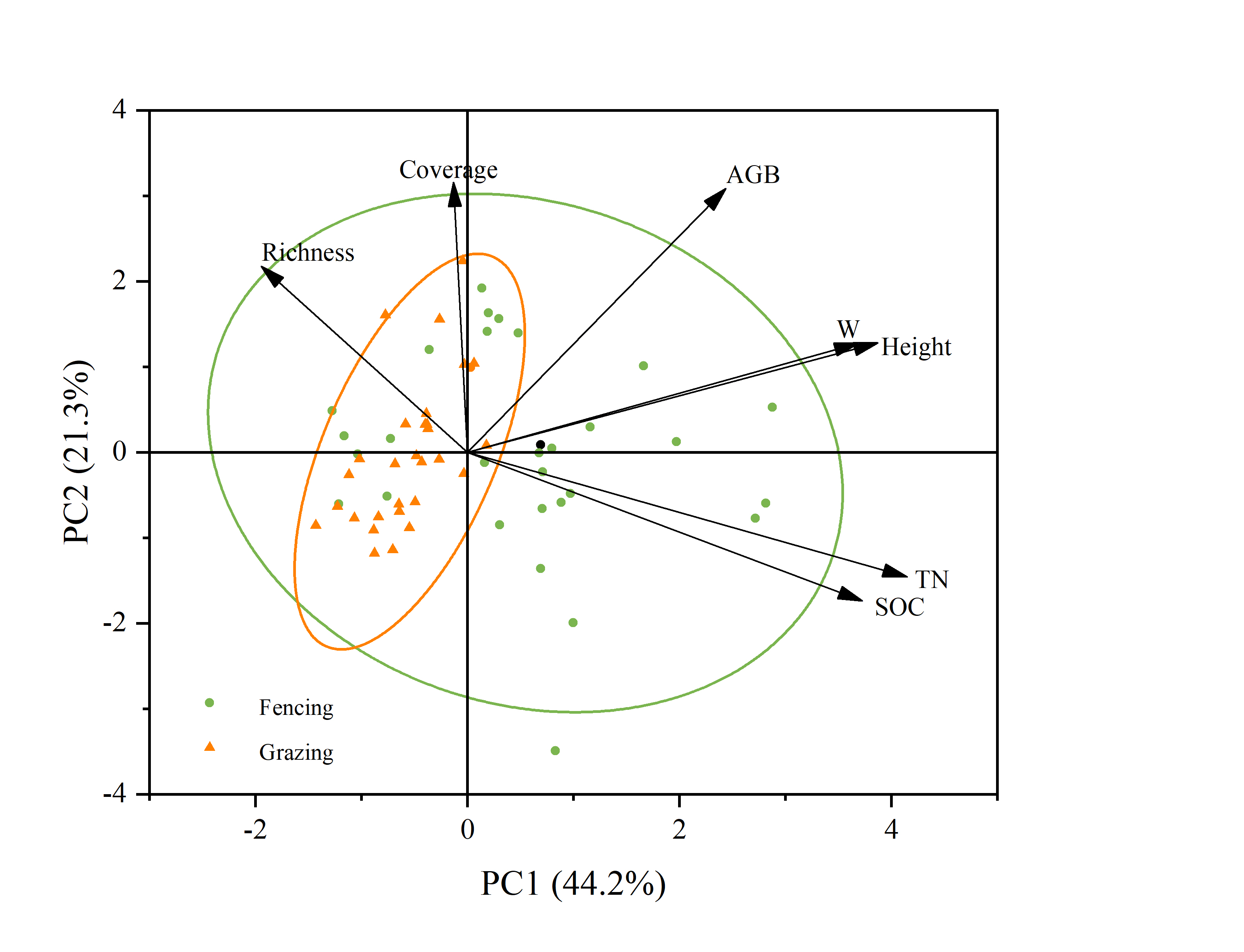 图3:长期围栏封育和放牧下高寒草甸植物群落与土壤性质的关系
