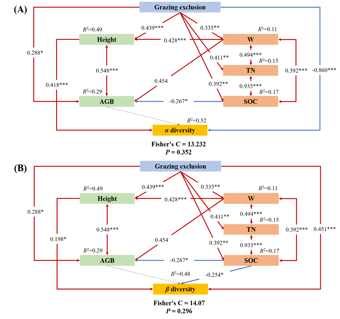 图4:结构方程模型评估了长期围栏封育和放牧对植物物种多样性(α-diversity)和群落相似性(β-diversity)的影响
