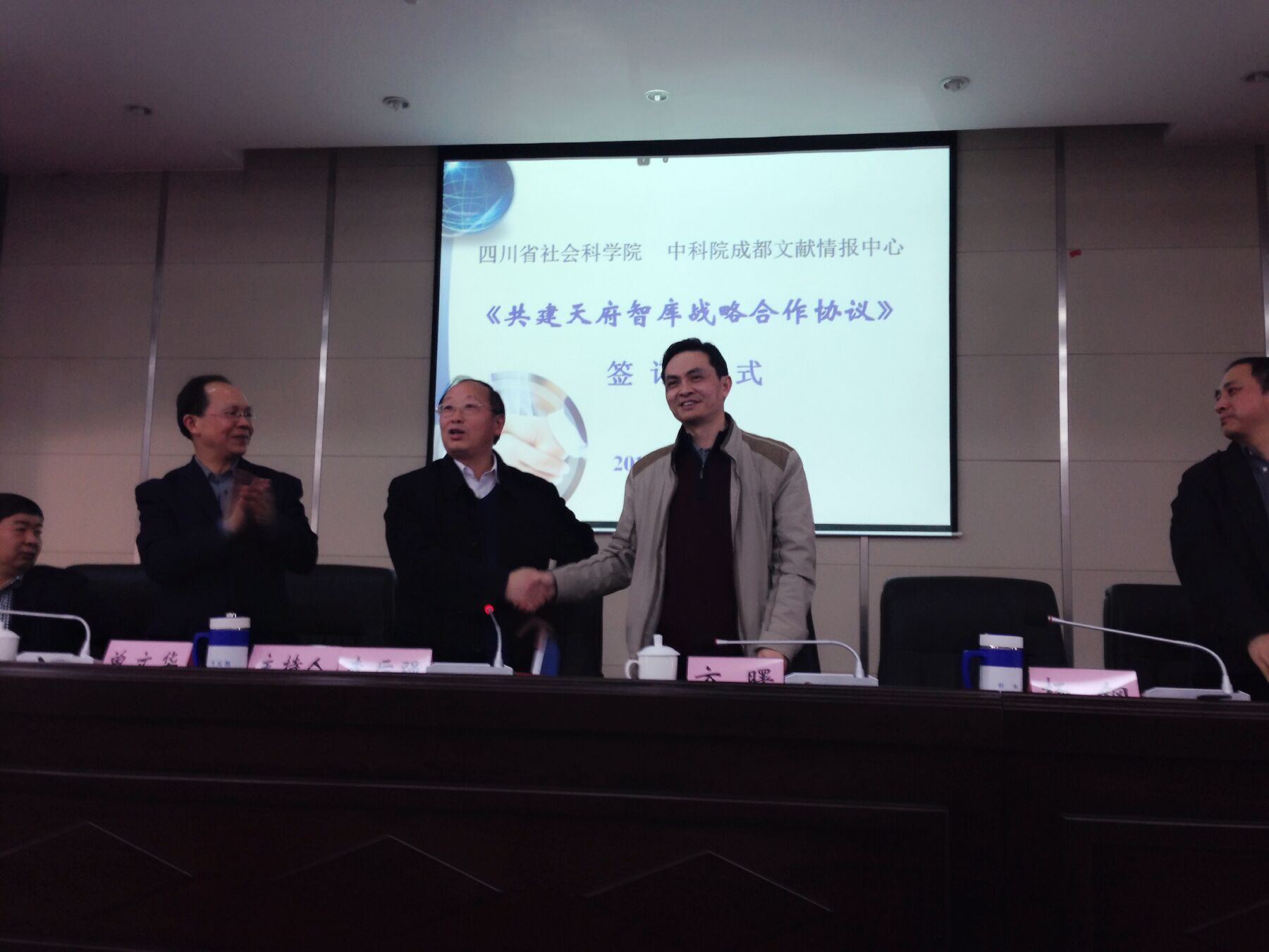 3月17日,为适应和引领新常态,落实国家“四个全面”的战略布局和四川省实施“三大发展战略”提供智力支持,中国科学院成都文献情报中心主任方曙与四川省社会科学院党委书记李后强共同签署了《共建天府智库战略合作协议》。成都文献情报中心党委书记曾文华,副主任邓勇、杨志萍与四川省社会科学院多位党委委员、副院长出席了签约仪式。