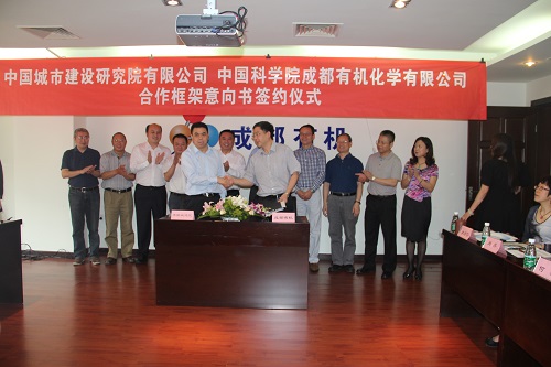 5月22日,成都有机化学公司与中国城市建设研究院有限公司(以下简称中国城建院)签订合作框架意向书,共同开展环境污染治理合作。成都有机化学公司董事长熊成东与中国城建院董事长王敬民代表合作双方签字。中国科学院国有资产经营有限责任公司(简称国科控股)总经理索继栓、中国建设科技集团股份有限公司副总裁徐文龙出席签约仪式。