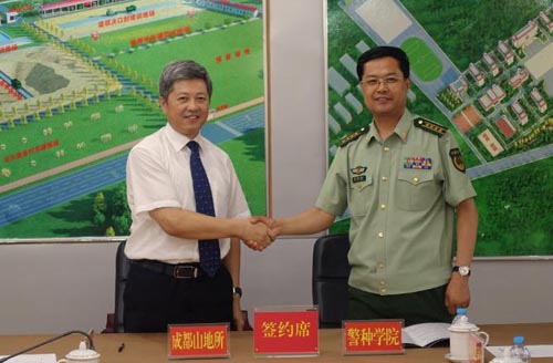 6月16日,中科院成都山地所所长邓伟、副所长文安邦一行赴北京与武警警种学院院长徐宝东、政委冯建华、副院长张生成等进行科技合作座谈,邓伟和徐宝东签署了《中国科学院水利部成都山地灾害与环境研究所—中国人民武装警察部队警种学院战略合作协议书》。冯建华主持签约座谈会。