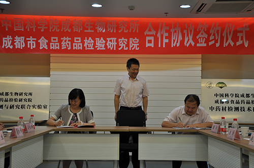 成都市食药管理局食品安全总监蒲旭峰,食药院相关部门负责人,成都生物所公共实验技术中心、天然药物室、科技处负责人参加了签约仪式,所长助理唐卓主持会议。