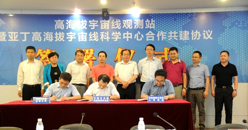 9月9日,继中国科学院与四川省人民政府签署框架协议后,中科院高能所、四川省甘孜州人民政府、中科院成都分院在成都签署高海拔宇宙线观测站暨亚丁高海拔宇宙线科学中心合作共建协议。四川省发改委省重点项目办主任胡玉清,中科院高能所所长王贻芳,甘孜州政府州长益西达瓦,中科院成都分院副院长陈锋、党组副书记王嘉图出席签约仪式。王嘉图主持签约仪式。