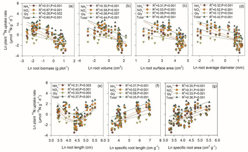研究认为,青藏高原冻融区根系特征和种间关系显著影响植物不同形态氮素吸收效率研究发现,粗根有利于提升高寒植物抗冻融能力,但会显著降低其氮素吸收速率;比根长和比表面积是决定NO3−, NH4+ 和甘氨酸吸收的关键指标。冻融环境下紫花针茅具有稳定的氮素吸收偏好(NO3−),而青藏苔草和矮火绒草对氮素吸收偏好会因临近物种的改变有所调整;紫花针茅-青藏苔草组合可以使得两者均保持高效的氮素吸收效率。